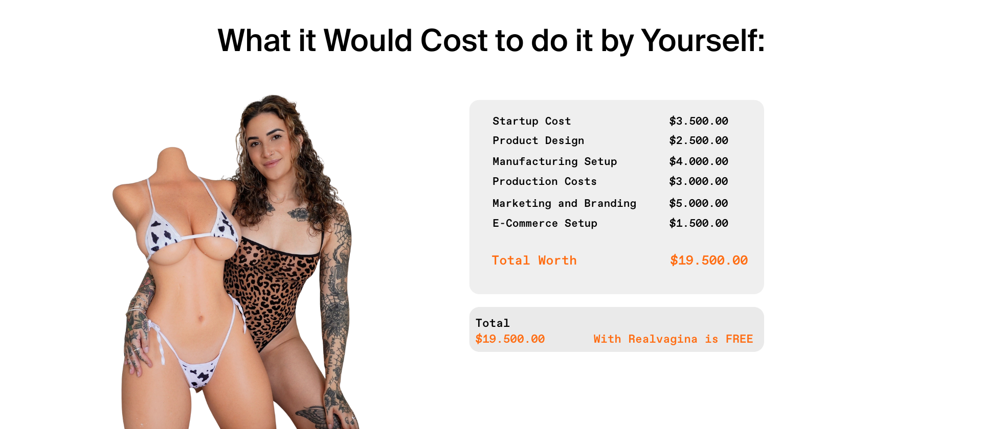 None! Intimaly covers all initial production andsetup costs, creating a product with 60-90%accuracy just for you.
